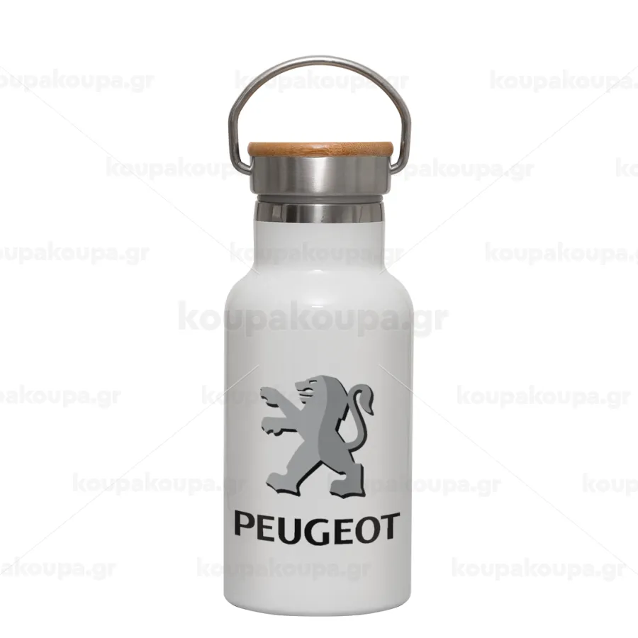 Peugeot, Metallic thermos (Stainless steel) White with wooden lid (bamboo), double-walled, 350ml