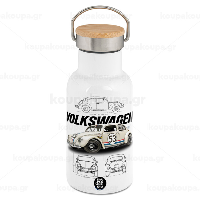 Volkswagen Beetle, Metallic thermos (Stainless steel) White with wooden lid (bamboo), double-walled, 350ml