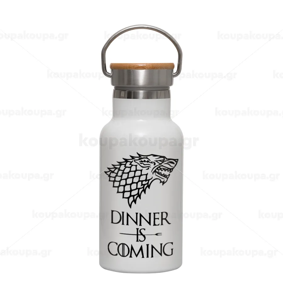 Dinner is coming (GOT), Metallic thermos (Stainless steel) White with wooden lid (bamboo), double-walled, 350ml