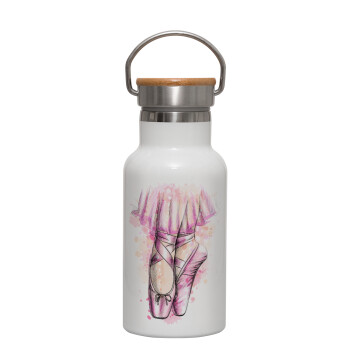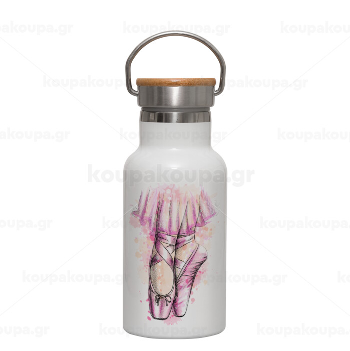 Ballerina shoes, Metallic thermos (Stainless steel) White with wooden lid (bamboo), double-walled, 350ml
