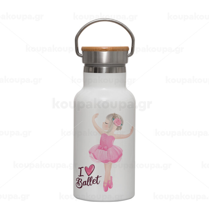 I Love Ballet, Metallic thermos (Stainless steel) White with wooden lid (bamboo), double-walled, 350ml