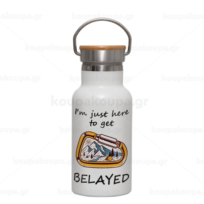 I'm just here to get Belayed, Metallic thermos (Stainless steel) White with wooden lid (bamboo), double-walled, 350ml