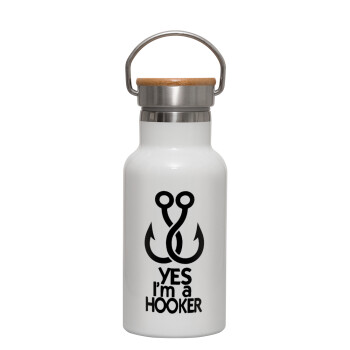 Yes i am Hooker, Metallic thermos (Stainless steel) White with wooden lid (bamboo), double-walled, 350ml