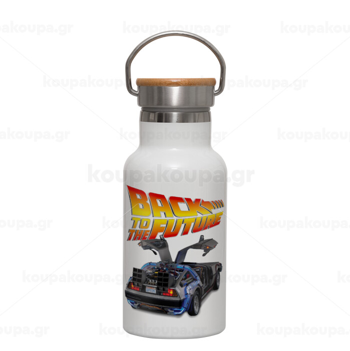Back to the future, Metallic thermos (Stainless steel) White with wooden lid (bamboo), double-walled, 350ml