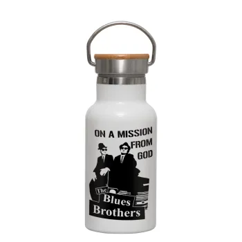 Blues brothers on a mission from God, Metallic thermos (Stainless steel) White with wooden lid (bamboo), double-walled, 350ml