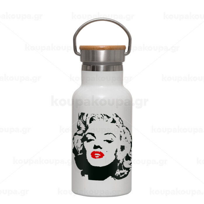 Merilin, Metallic thermos (Stainless steel) White with wooden lid (bamboo), double-walled, 350ml