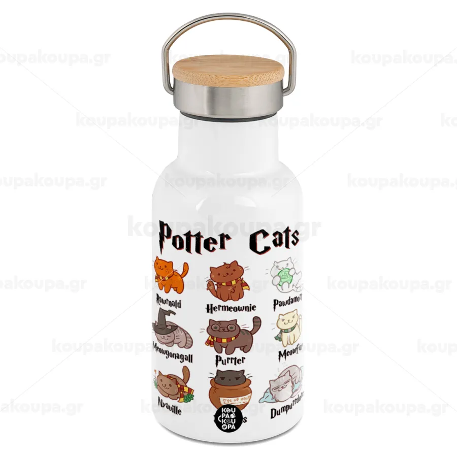 Potter Cats, Metallic thermos (Stainless steel) White with wooden lid (bamboo), double-walled, 350ml