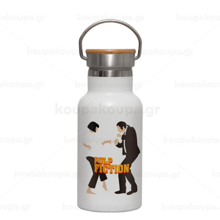 Pulp Fiction dancing, Metallic thermos (Stainless steel) White with wooden lid (bamboo), double-walled, 350ml