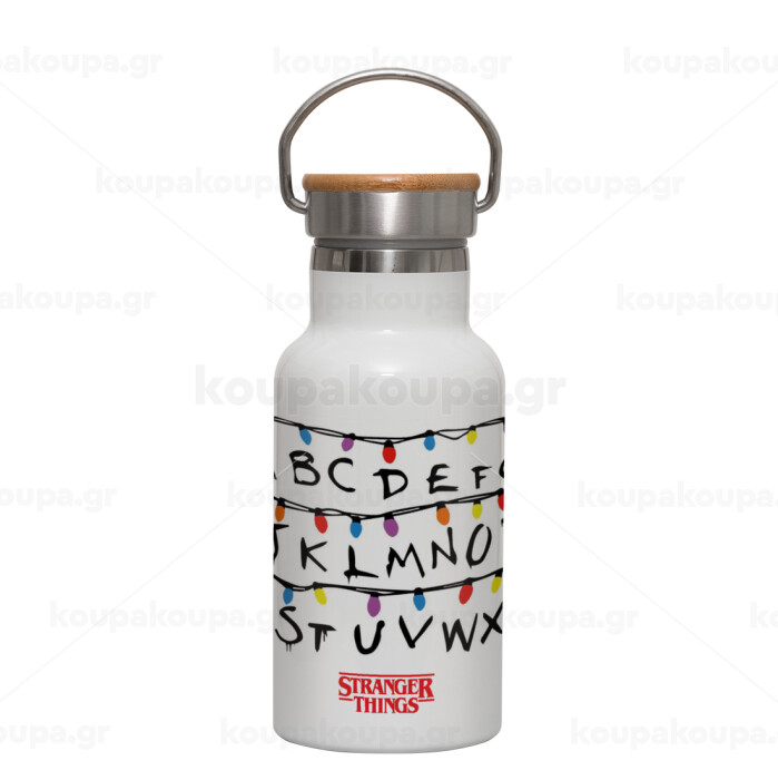 Stranger Things ABC, Metallic thermos (Stainless steel) White with wooden lid (bamboo), double-walled, 350ml