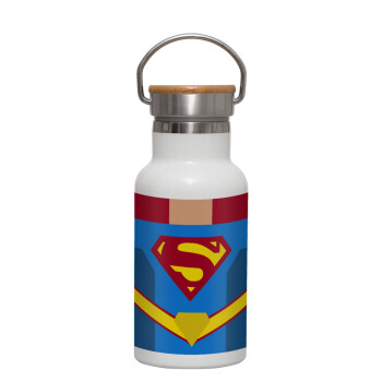 Superman flat, Metallic thermos (Stainless steel) White with wooden lid (bamboo), double-walled, 350ml