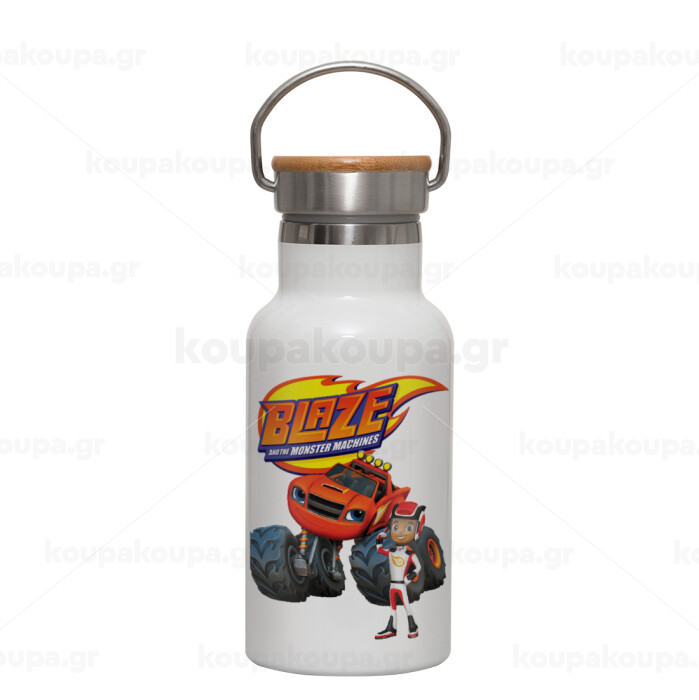Ο Μπλέιζ και οι Φίλοι του, Metallic thermos (Stainless steel) White with wooden lid (bamboo), double-walled, 350ml