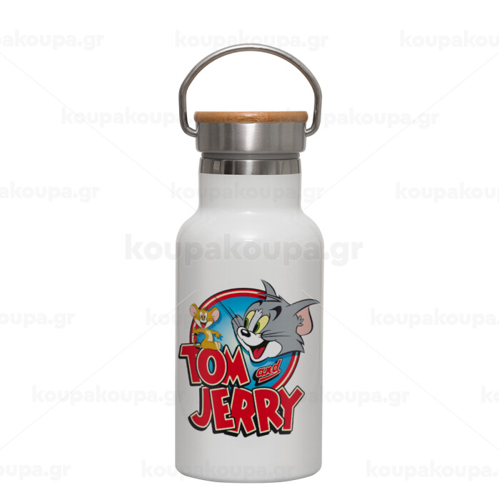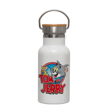 Tom and Jerry, Metallic thermos (Stainless steel) White with wooden lid (bamboo), double-walled, 350ml