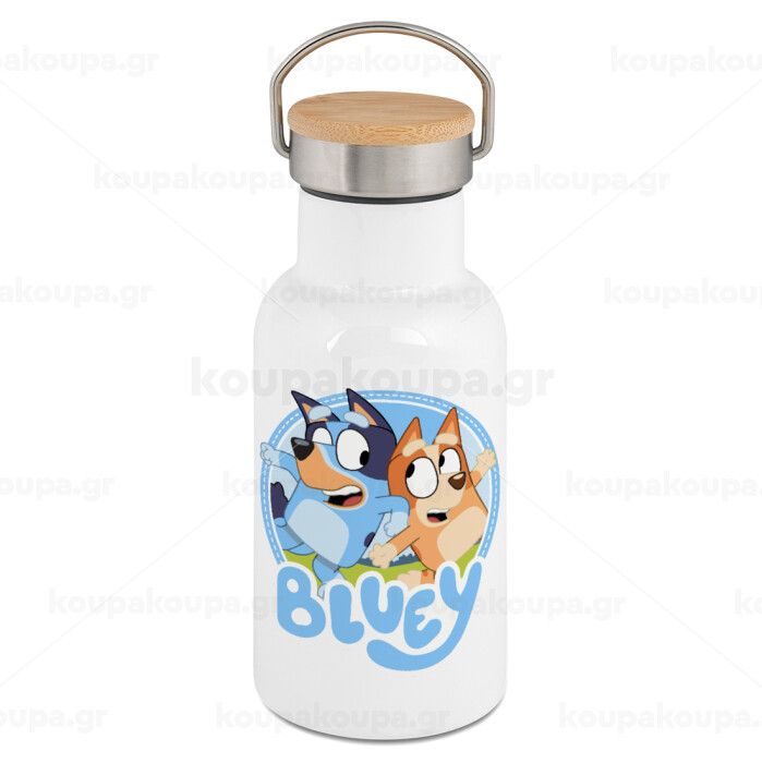 Μπλε, Metallic thermos (Stainless steel) White with wooden lid (bamboo), double-walled, 350ml
