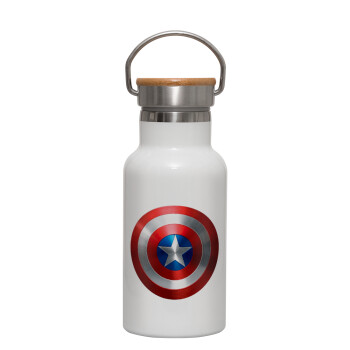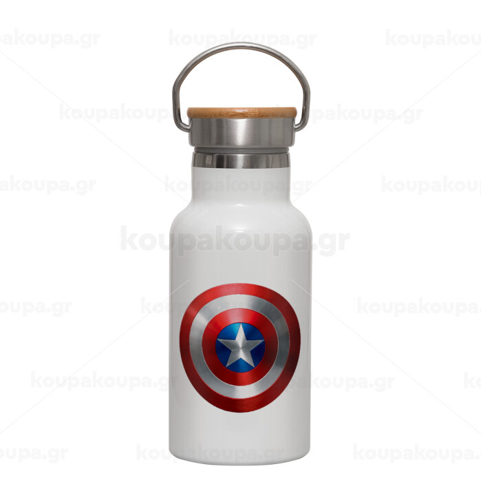 Captain America, Metallic thermos (Stainless steel) White with wooden lid (bamboo), double-walled, 350ml