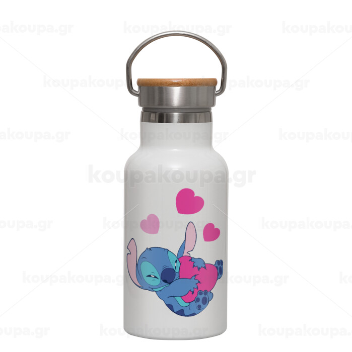 Lilo & Stitch hugs and hearts, Metallic thermos (Stainless steel) White with wooden lid (bamboo), double-walled, 350ml