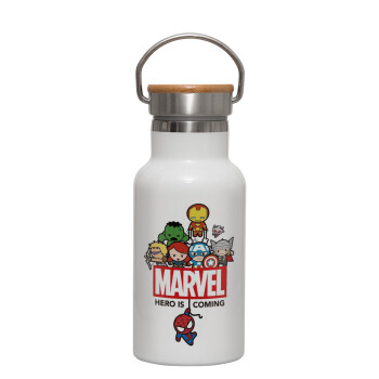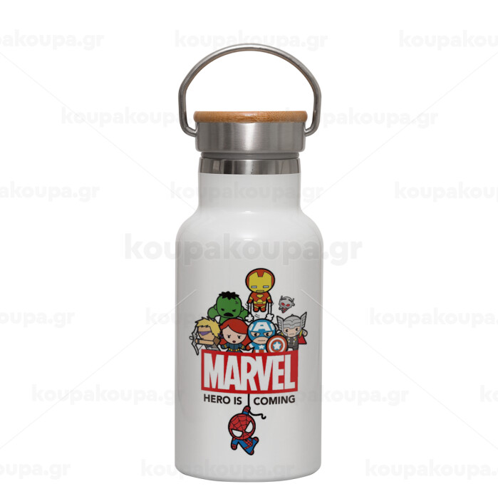 MARVEL, Metallic thermos (Stainless steel) White with wooden lid (bamboo), double-walled, 350ml