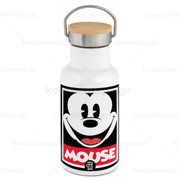 Mickey Mouse, Metallic thermos (Stainless steel) White with wooden lid (bamboo), double-walled, 350ml
