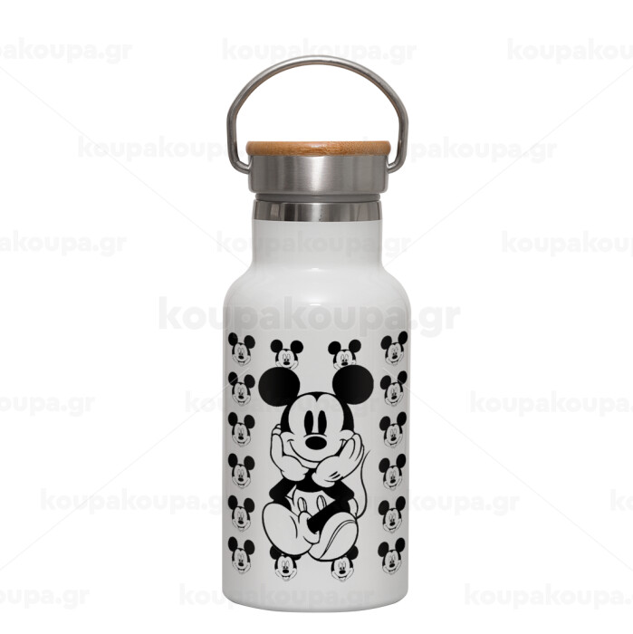 Mickey, Metallic thermos (Stainless steel) White with wooden lid (bamboo), double-walled, 350ml