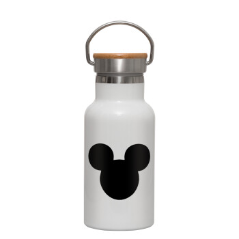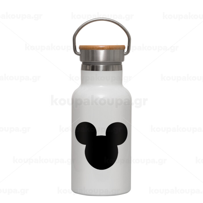 mouse man, Metallic thermos (Stainless steel) White with wooden lid (bamboo), double-walled, 350ml