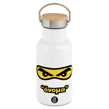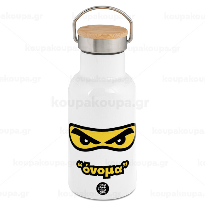 Ninja Eyes με όνομα, Metallic thermos (Stainless steel) White with wooden lid (bamboo), double-walled, 350ml