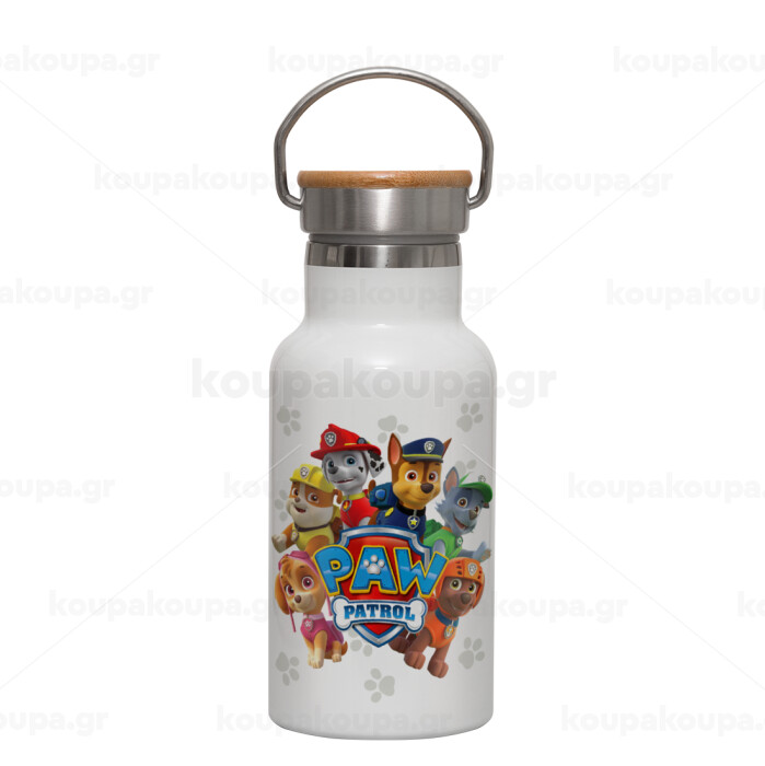 PAW patrol, Metallic thermos (Stainless steel) White with wooden lid (bamboo), double-walled, 350ml