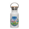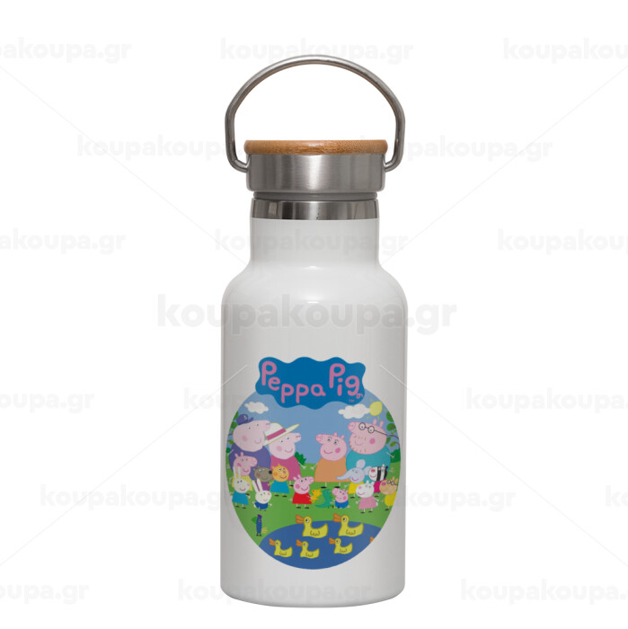 Peppa pig Family, Metallic thermos (Stainless steel) White with wooden lid (bamboo), double-walled, 350ml