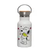Snoopy Love, Metallic thermos (Stainless steel) White with wooden lid (bamboo), double-walled, 350ml