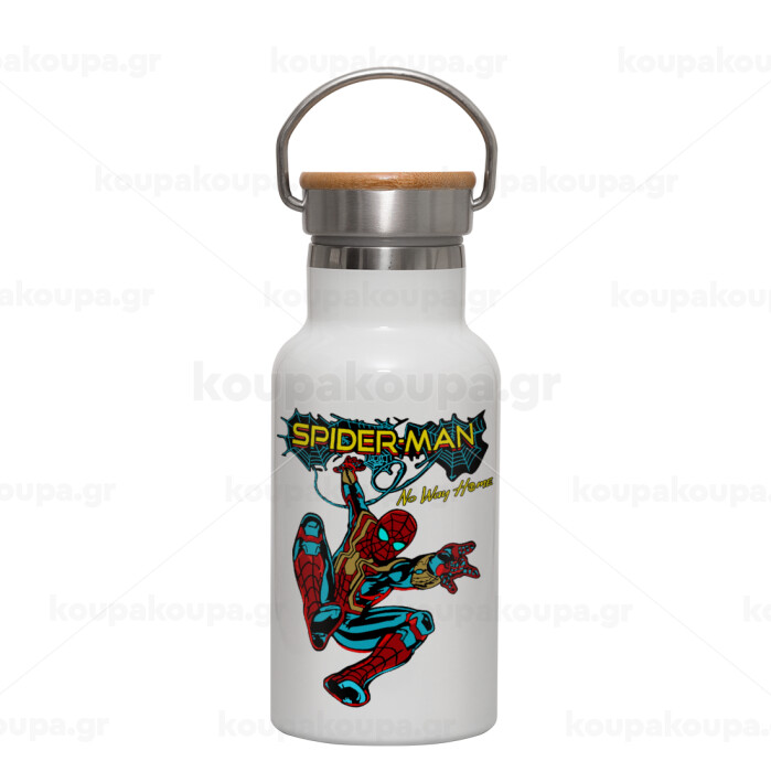 Spiderman no way home, Metallic thermos (Stainless steel) White with wooden lid (bamboo), double-walled, 350ml