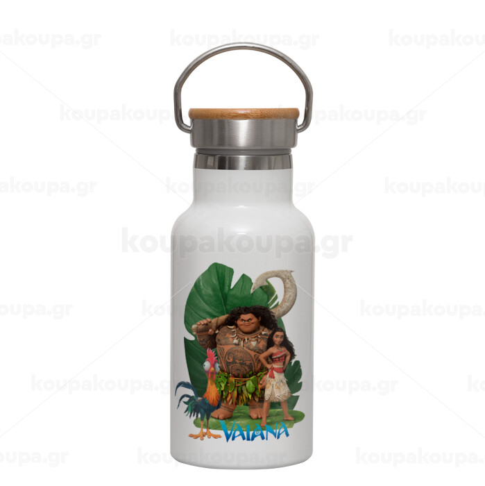 Vaiana, Metallic thermos (Stainless steel) White with wooden lid (bamboo), double-walled, 350ml