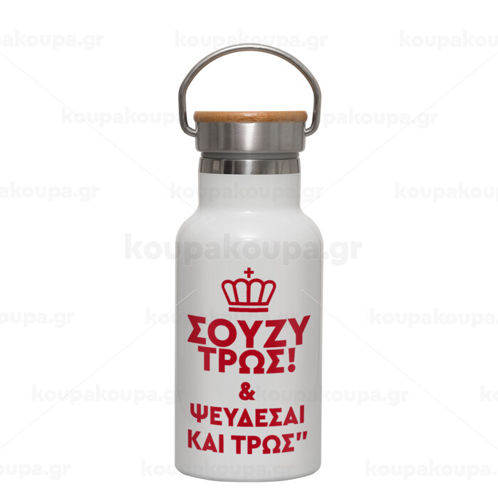 Σούζυ και ψεύδεσαι και τρως, Metallic thermos (Stainless steel) White with wooden lid (bamboo), double-walled, 350ml