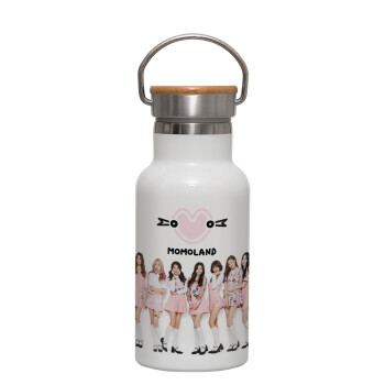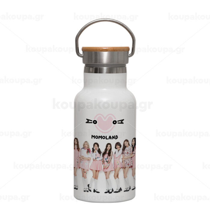 Momoland pink, Metallic thermos (Stainless steel) White with wooden lid (bamboo), double-walled, 350ml