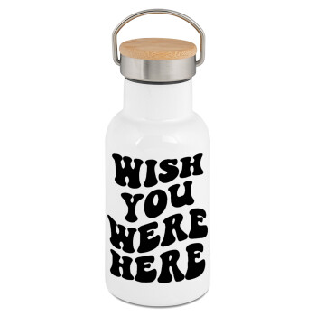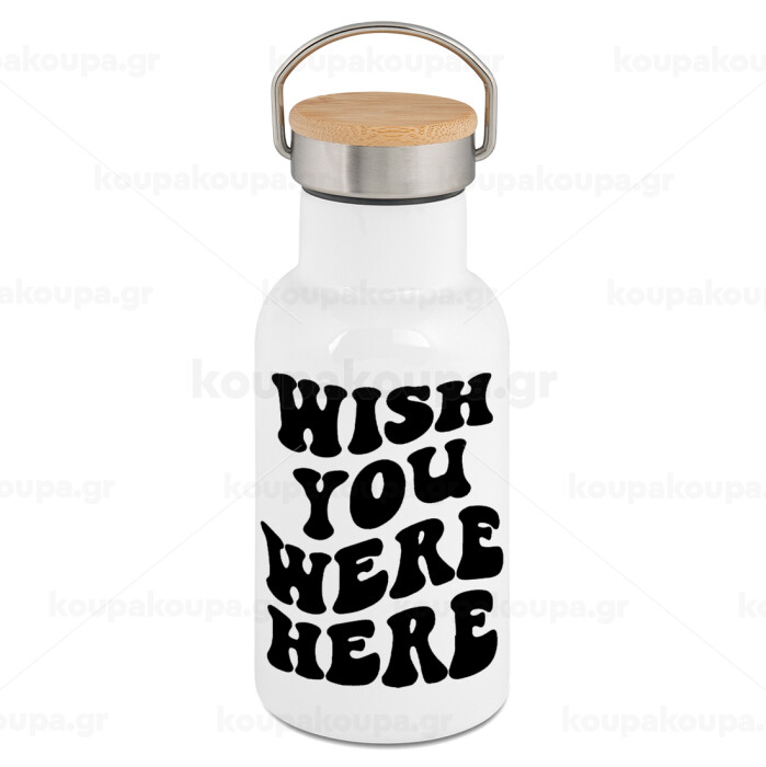 Wish you were here, Metallic thermos (Stainless steel) White with wooden lid (bamboo), double-walled, 350ml