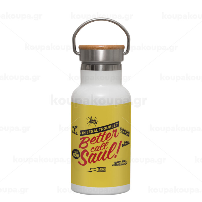 Better Call Saul, Metallic thermos (Stainless steel) White with wooden lid (bamboo), double-walled, 350ml