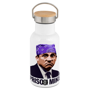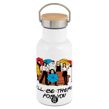 Friends cover, Metallic thermos (Stainless steel) White with wooden lid (bamboo), double-walled, 350ml