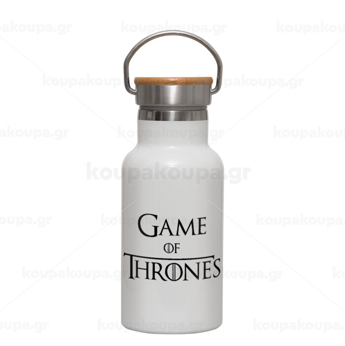 Game of Thrones, Metallic thermos (Stainless steel) White with wooden lid (bamboo), double-walled, 350ml