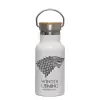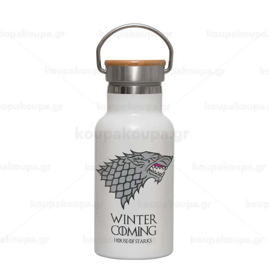 GOT House of Starks, winter coming, Metallic thermos (Stainless steel) White with wooden lid (bamboo), double-walled, 350ml