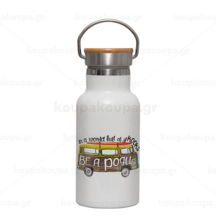 Outerbanks Pogue Life, Metallic thermos (Stainless steel) White with wooden lid (bamboo), double-walled, 350ml