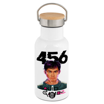 Squid game 456 Gi-Hun, Metallic thermos (Stainless steel) White with wooden lid (bamboo), double-walled, 350ml