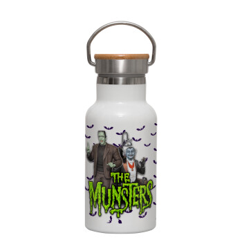 The munsters, Metallic thermos (Stainless steel) White with wooden lid (bamboo), double-walled, 350ml