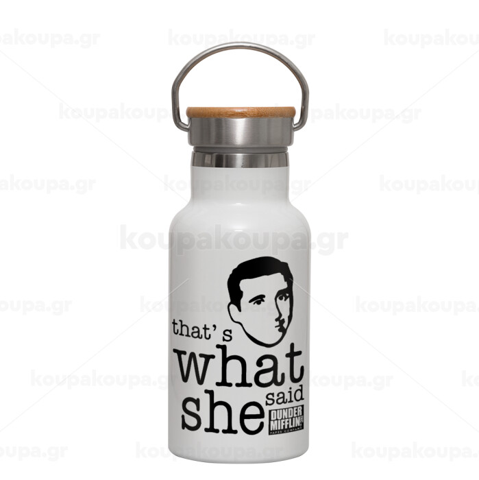 The office Michael That's what she said, Metallic thermos (Stainless steel) White with wooden lid (bamboo), double-walled, 350ml