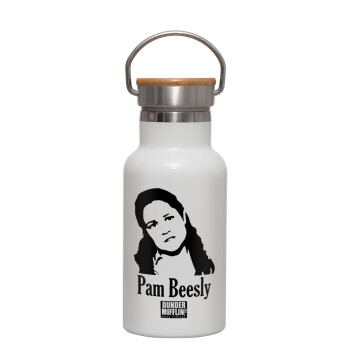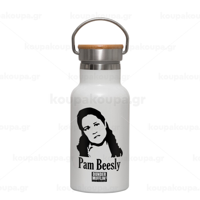 The office Pam Beesly, Metallic thermos (Stainless steel) White with wooden lid (bamboo), double-walled, 350ml