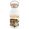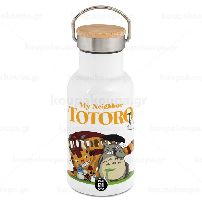 Totoro and Cat, Metallic thermos (Stainless steel) White with wooden lid (bamboo), double-walled, 350ml