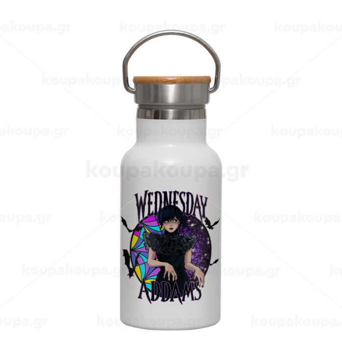 Wednesday Jenna Ortega, Metallic thermos (Stainless steel) White with wooden lid (bamboo), double-walled, 350ml