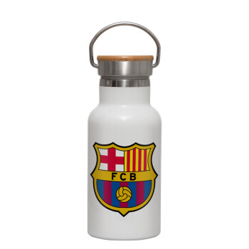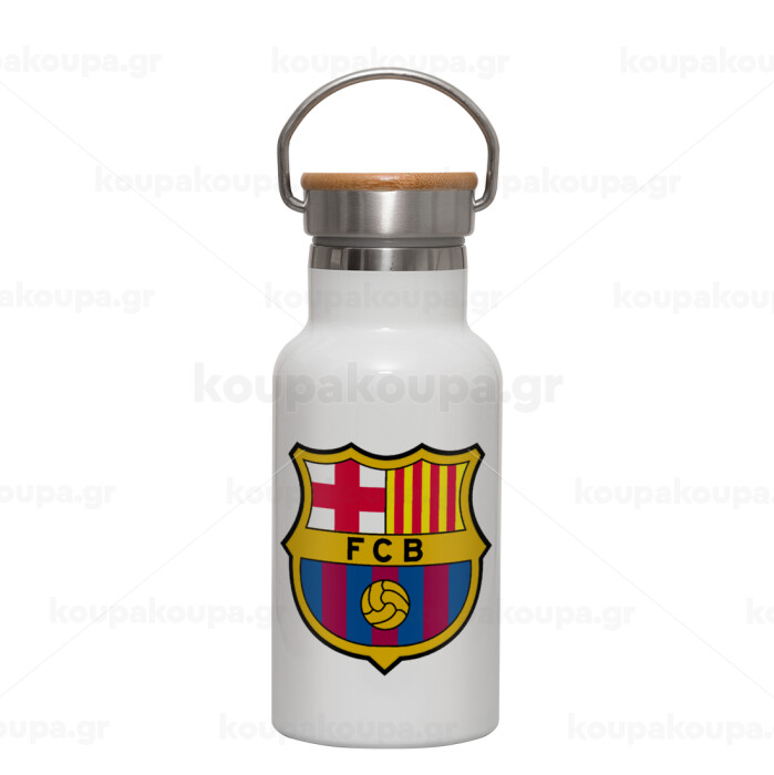 Barcelona FC, Metallic thermos (Stainless steel) White with wooden lid (bamboo), double-walled, 350ml
