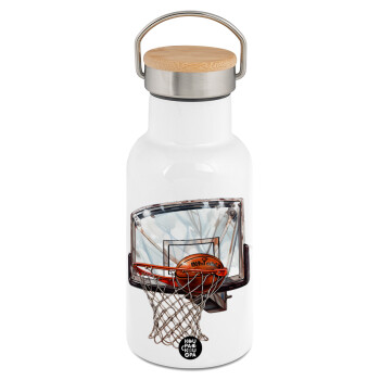 Basketball, Metallic thermos (Stainless steel) White with wooden lid (bamboo), double-walled, 350ml