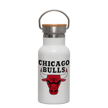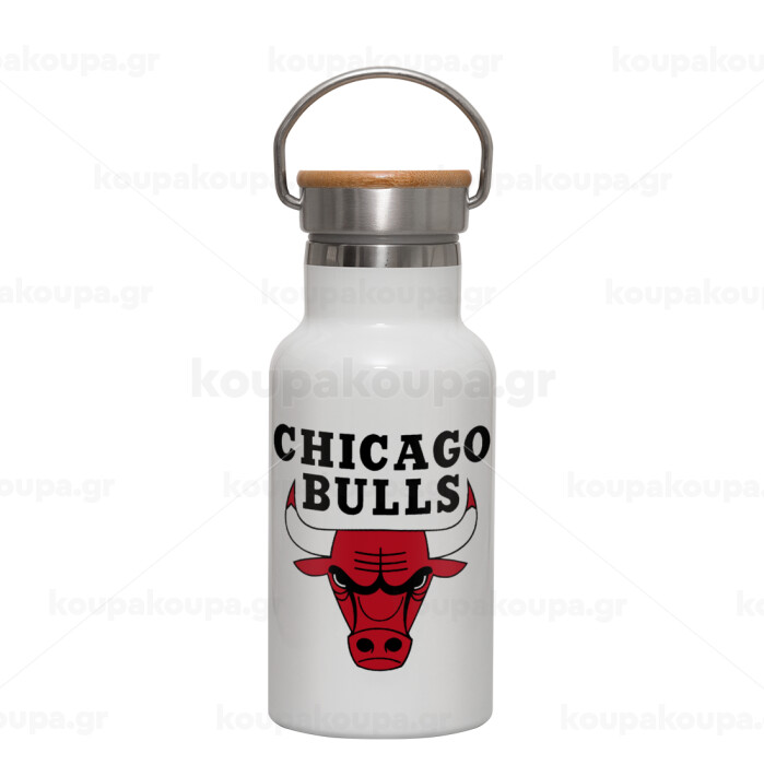 Chicago Bulls, Metallic thermos (Stainless steel) White with wooden lid (bamboo), double-walled, 350ml