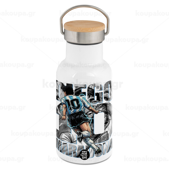 Diego Maradona (Ντιέγκο Μαραντόνα), Metallic thermos (Stainless steel) White with wooden lid (bamboo), double-walled, 350ml