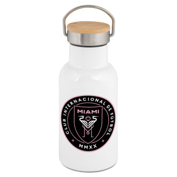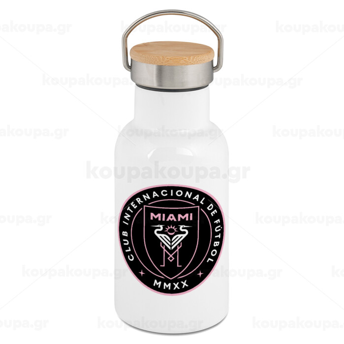 Inter Miami CF, Metallic thermos (Stainless steel) White with wooden lid (bamboo), double-walled, 350ml