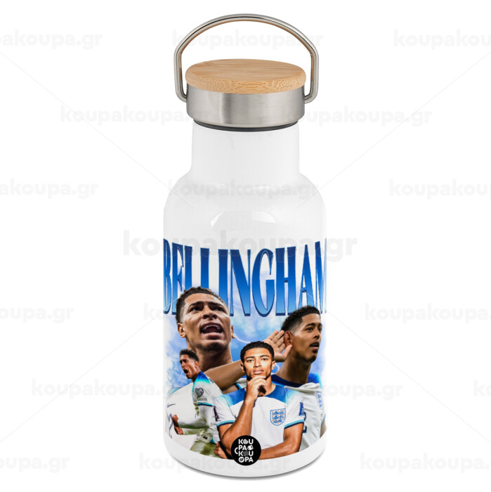 Jude Bellingham, Metallic thermos (Stainless steel) White with wooden lid (bamboo), double-walled, 350ml