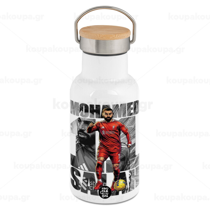 Mohamed Salah (Μοχάμεντ Σαλάχ), Metallic thermos (Stainless steel) White with wooden lid (bamboo), double-walled, 350ml